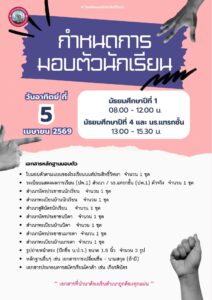 กำหนดการมอบตัวนักเรียนปีการศึกษา 2569 วันอาทิตย์ที่ 5 เมษายน 2569 ม.1 เวลา 08.00 – 12.00 น. ม.4 และ นร.