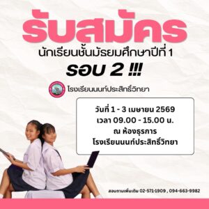 เปิดรับสมัครนักเรียนชั้นมัธยมศึกษาปีที่ 1 รอบ 2 วันที่ 1 – 3 เมษายน 2569 เวลา 09.00 – 15.00 น.