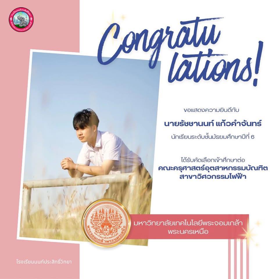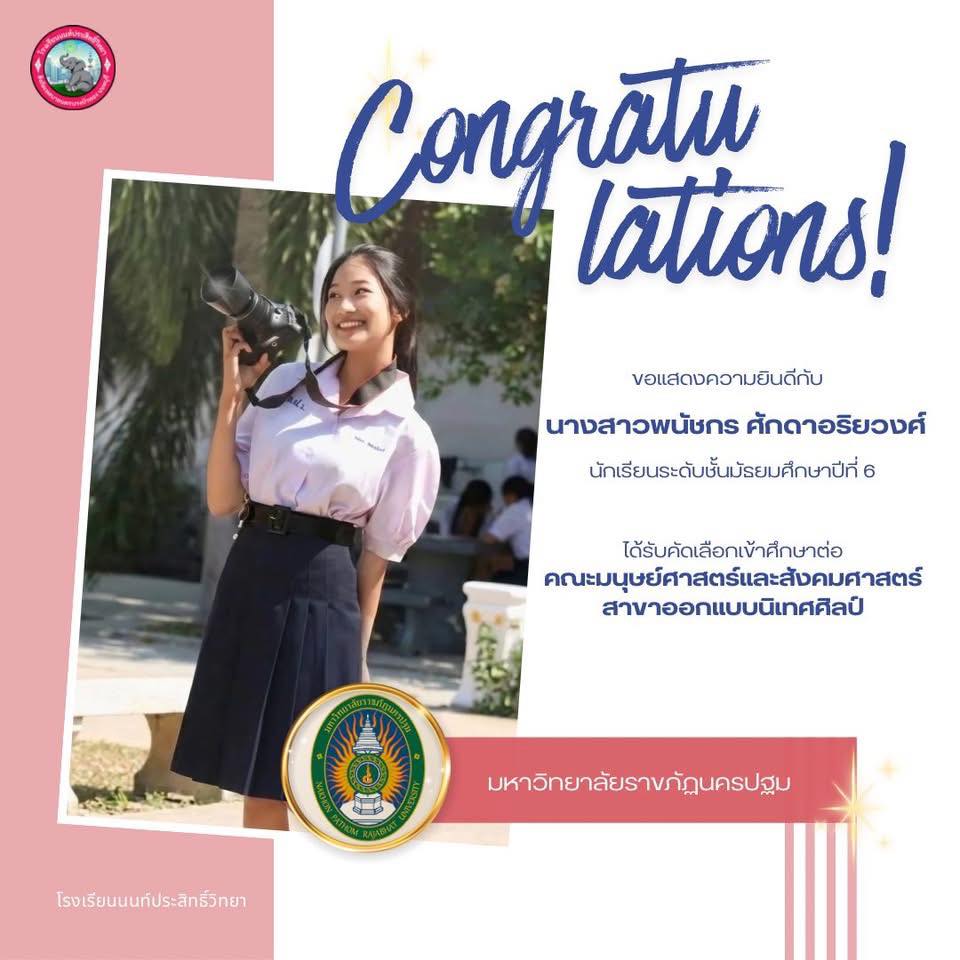 โรงเรียนนนท์ประสิทธิ์วิทยา ขอแสดงความยินดีกับนักเรียนระดับชั้นมัธยมศึกษาปีที่ 6 ที่ได้รับการคัดเลือกเข้าศึกษาต่อในระดับอุดมศึกษา สร้างความภาคภูมิใจให้กับครอบครัวและสถานศึกษา ✨