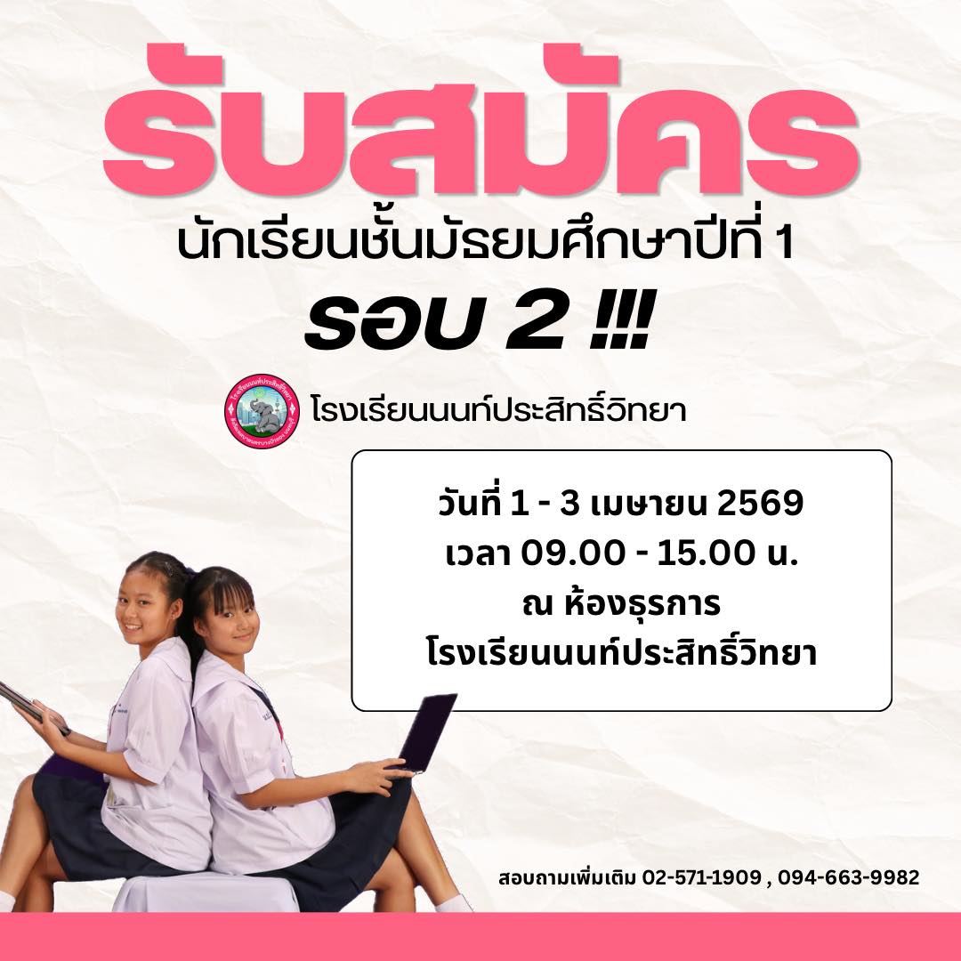 เปิดรับสมัครนักเรียนชั้นมัธยมศึกษาปีที่ 1 รอบ 2 วันที่ 1 – 3 เมษายน 2569 เวลา 09.00 – 15.00 น. ณ ห้องธุรการ โรงเรียนนนท์ประสิทธิ์วิทยา . สอบถามเพิ่มเติม: 02-571-1909, 094-663-9982 #โรงเรียนนนท์ประสิทธิ์วิทยา #เทศบาลนครบางบัวทอง #รับสมัครนักเรียน2569 #ปีการศึกษา2569 วันเด็กแห่งชาติ ประกาศรายชื่อนักเรียนผู้มีสิทธิ์เข้าศึกษาต่อในระดับชั้นมัธยมศึกษาปีที่ 1 และชั้นมัธยมศึกษาปีที่ 4 ปีการศึกษา 2569