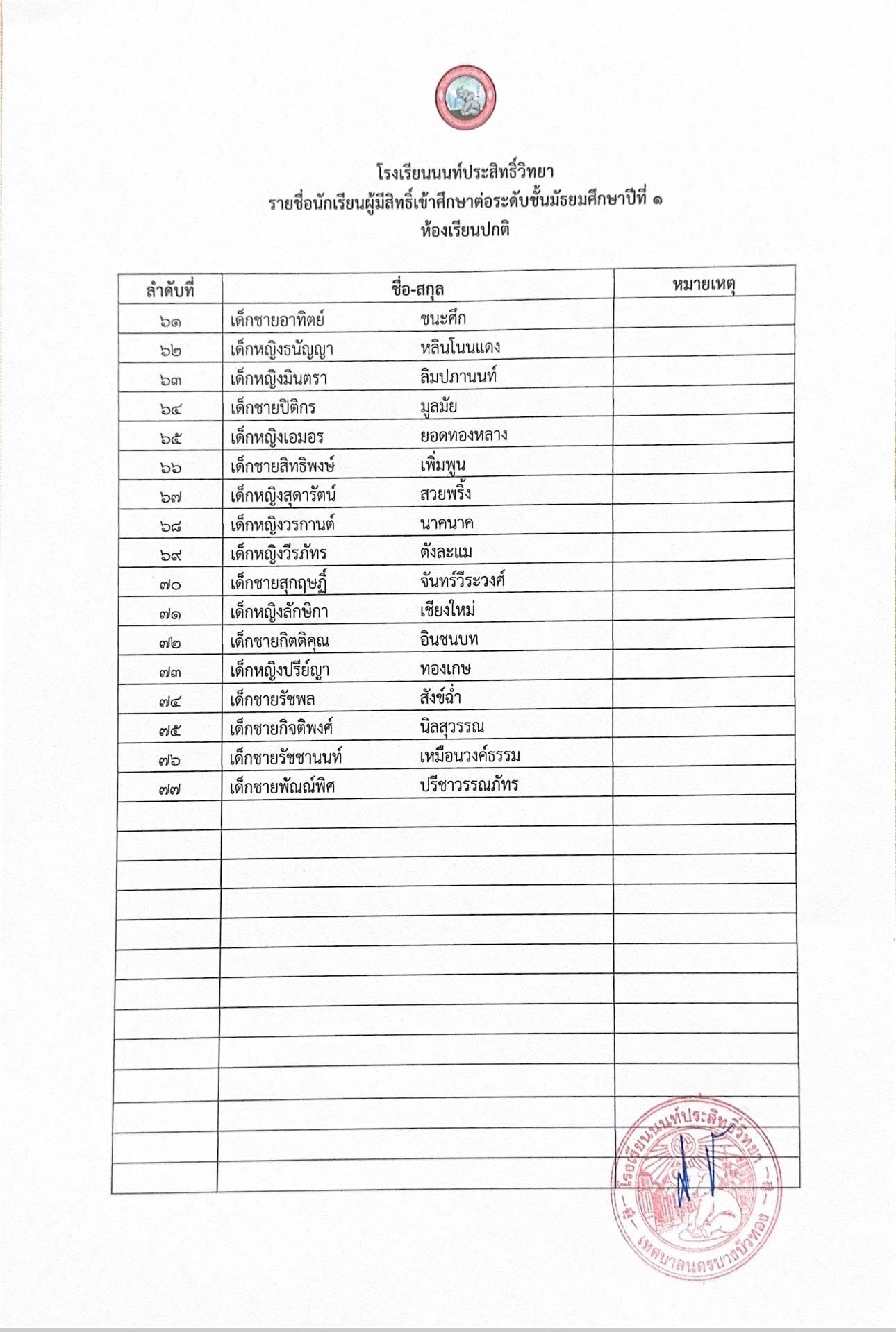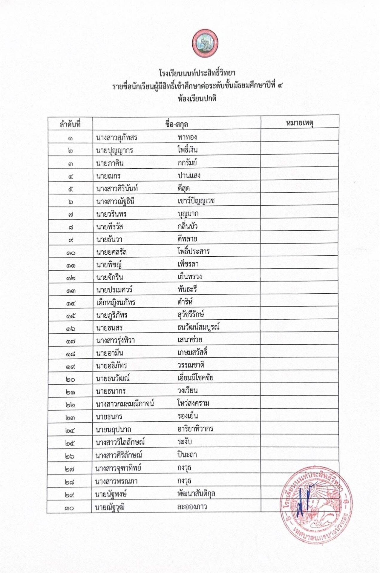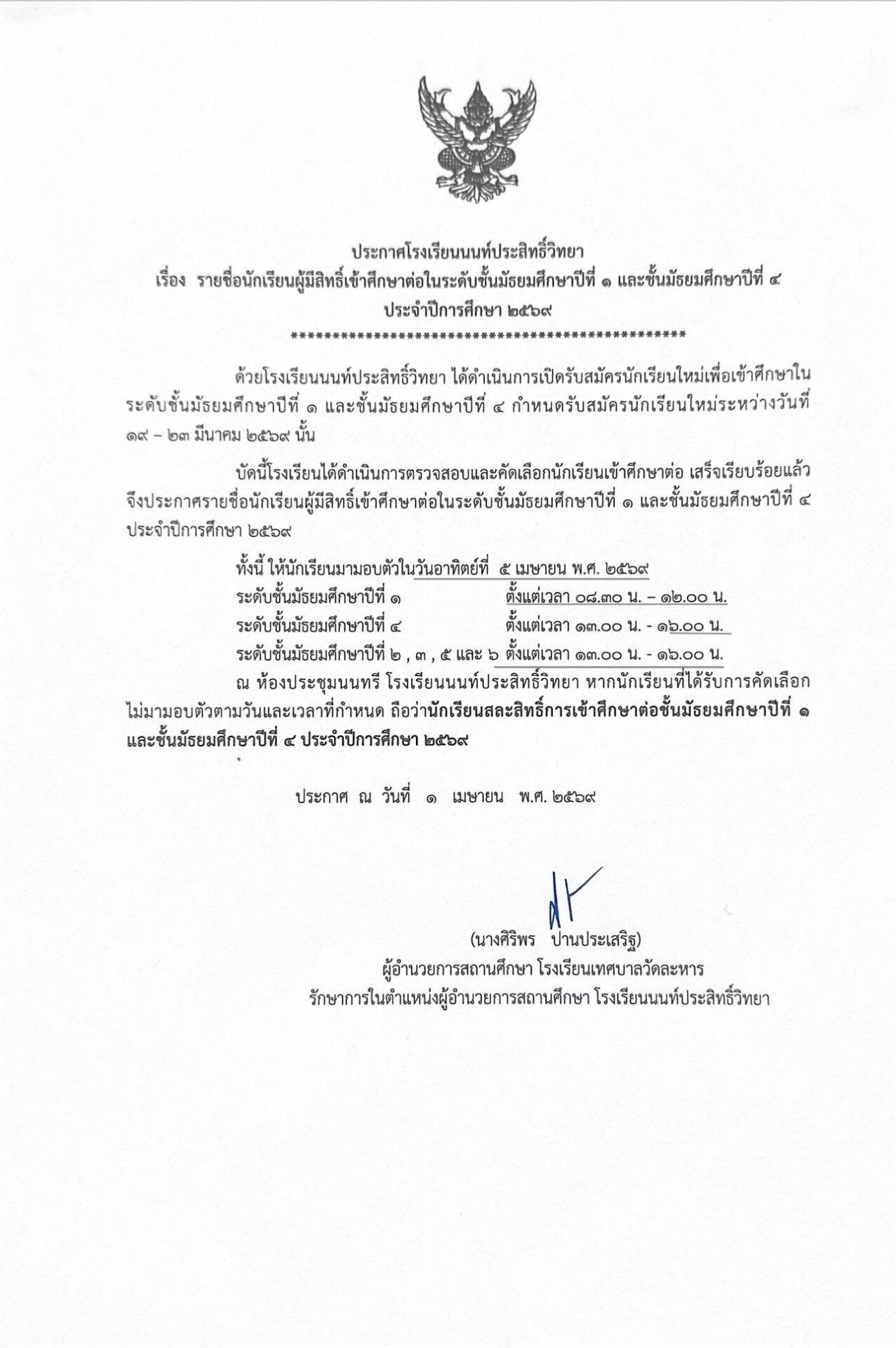 ประกาศรายชื่อนักเรียนผู้มีสิทธิ์เข้าศึกษาต่อในระดับชั้นมัธยมศึกษาปีที่ 1 และชั้นมัธยมศึกษาปีที่ 4 ปีการศึกษา 2569